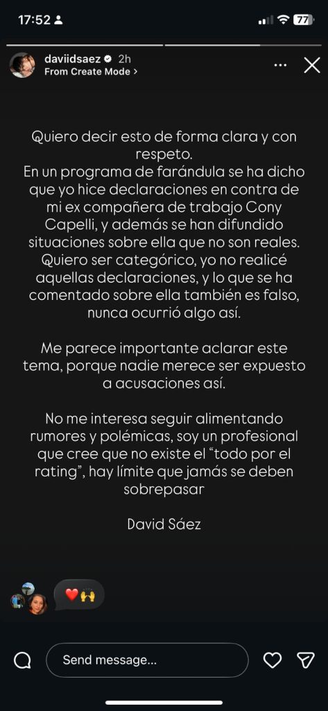 “Quiero decir esto de forma clara y con respeto. En un programa de farándula se ha dicho que yo hice declaraciones en contra de mi excompañera de trabajo Cony Capelli, y además se han difundido situaciones sobre ella que no son reales”, partió señalando.