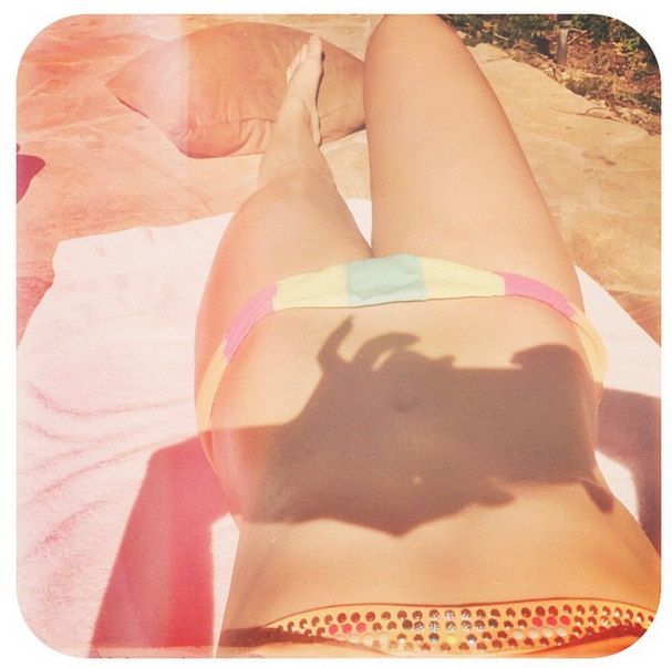 En un colorido bikini y tomando sol, la también actriz posa recostada luciendo un escultural cuerpo que ha conseguido gracias a una estricta rutina de ejercicios y una alimentación saludable.