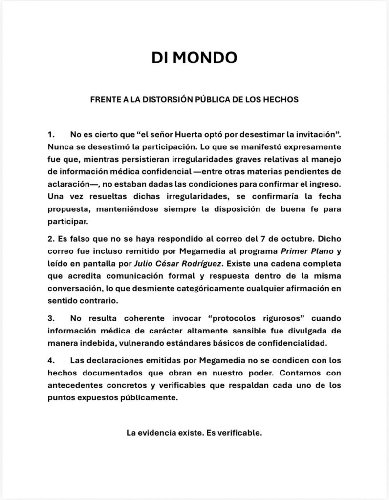 Di Mondo arremete contra Megamedia: “Información médica sensible fue divulgada de manera indebida”