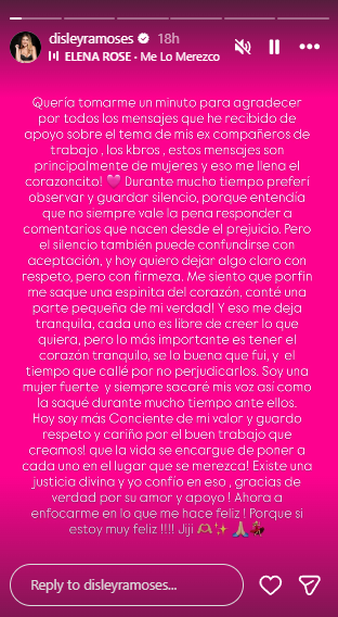 Tras esta nueva versión de los hechos, Disley Ramos volvió a referirse a la polémica, esta vez a través de un extenso mensaje publicado en sus historias de Instagram.