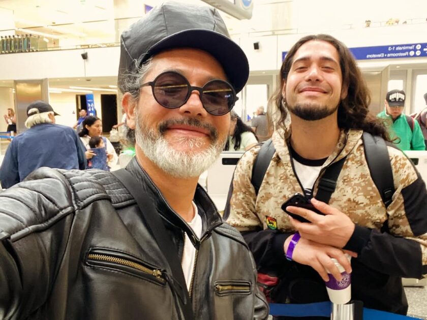 En una de las fotos, ambos aparecen hace más de 20 años, cuando Baltazar, aun un bebé, posa junto a una guitarra. En la siguiente imagen, se les ve reunidos en el aeropuerto, posando nuevamente.