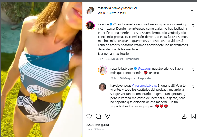 No obstante, el que más llamó la atención fue el de Carlos Caorsi, su esposo. “Cuando se está vacío se busca culpar a los demás y victimizarse. Donde hay intereses comerciales, no hay lealtad ni ética. Pero finalmente todos nos sometemos a la verdad y a la conciencia propia”, partió señalando.