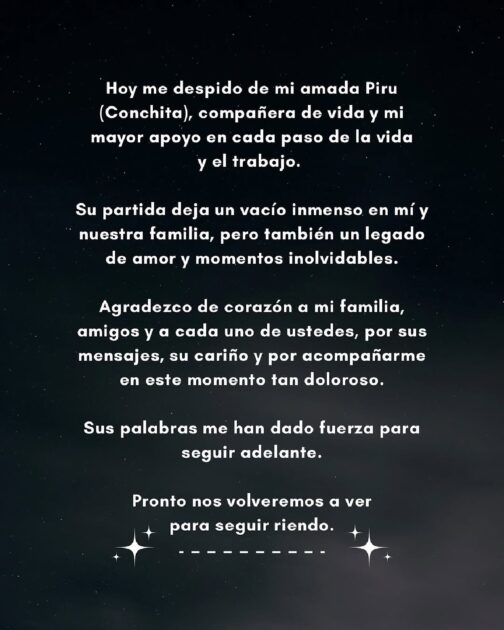 “Hoy me despido de mi amada Piru (Conchita), compañera de vida y mi mayor apoyo en cada paso de la vida y el trabajo“, comenzó escribiendo.