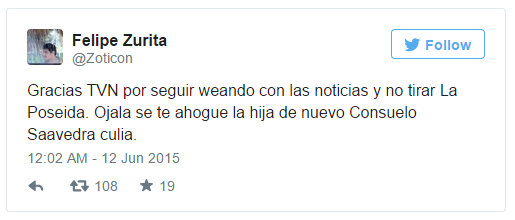 El pasado viernes, el noticiero de TVN debió aplazar su trasmisión debido al partido entre Chile y Ecuador. Esto significó que la teleserie nocturna La Poseída tuvo que salir al aire más tarde de lo acostumbrado, lo cual molestó a varios televidentes. Pero un usuario de Twitter llevó su ira a un nivel completamente inaceptable.