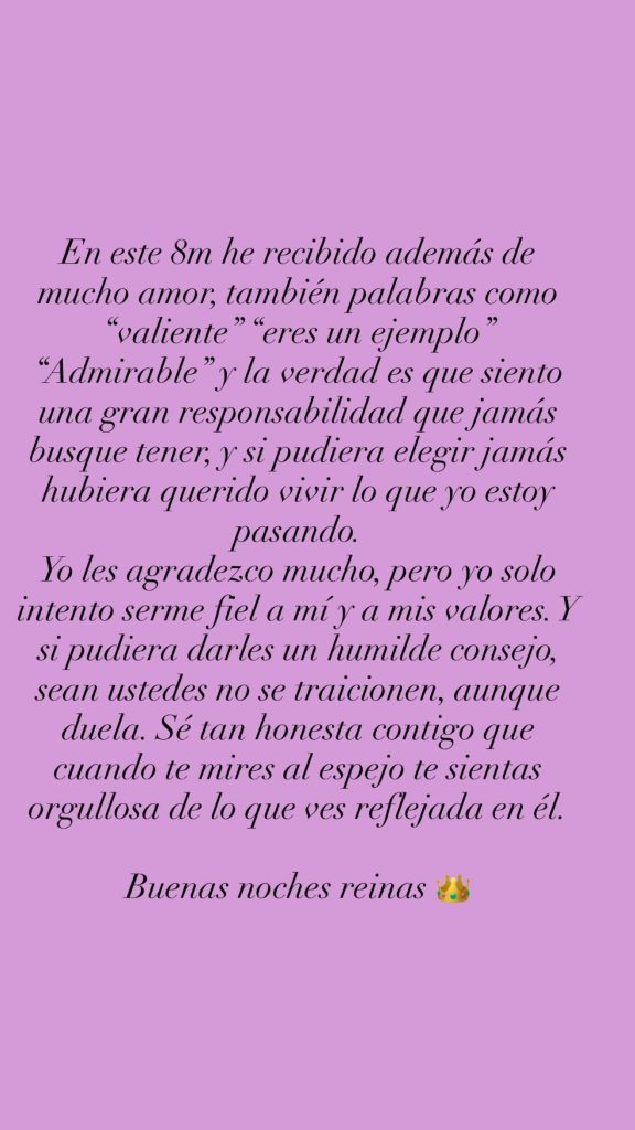 “Este 8M he recibido, además de mucho amor, también palabras como ‘valiente’, ‘eres un ejemplo’, ‘admirable’ y, la verdad, es que siento una gran responsabilidad que jamás busqué tener. Y si pudiera elegir, jamás hubiera querido vivir lo que yo estoy pasando”, señaló de entrada.
