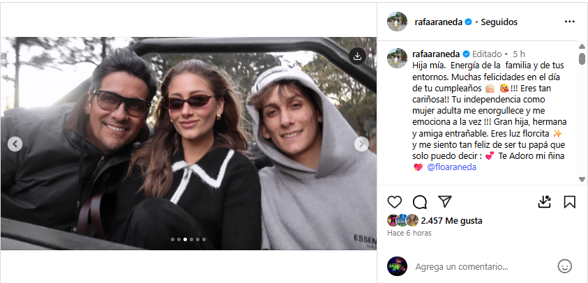 En su mensaje, agregó que Florencia “es una gran hija, hermana y amiga entrañable. Eres luz, florcita, y me siento tan feliz de ser tu papá que solo puedo decir: Te adoro, mi niña”.
