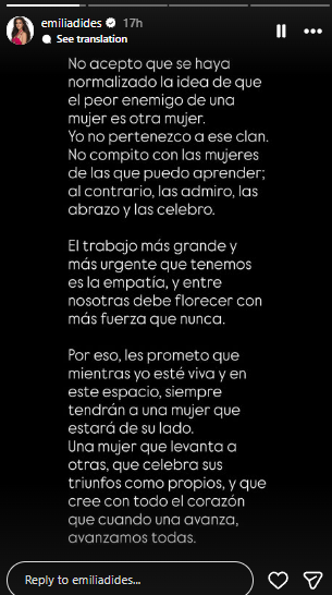 No acepto que se haya normalizado la idea de que el peor enemigo de una mujer es otra mujer. Yo no pertenezco a ese clan”, comenzó escribiendo.