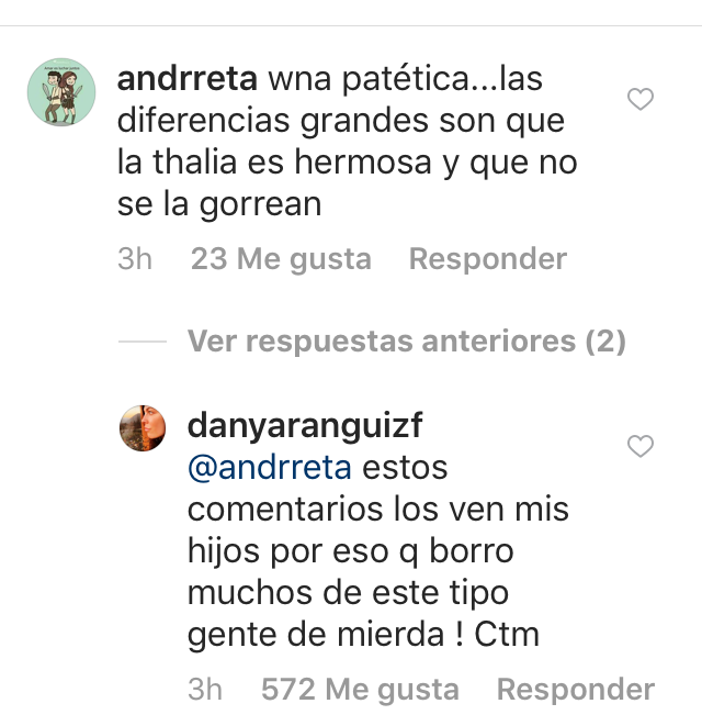 Pero esta publicación recibió un comentario que no fue para nada de su gusto y motivos tenía. Una usuaria le escribió “wna patética, las diferencias grandes son que Thalía es hermosa y que no se la gorrean”. Daniela no se quedó callada y se lanzó contra ella: “Estos comentarios los ven mis hijos por eso que borro muchos de este tipo, ¡gente de mierda!”