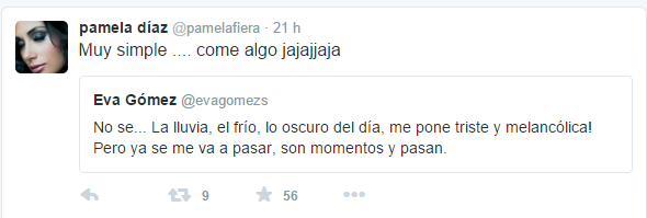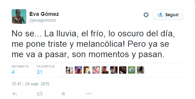 “No se… La lluvia, el frío, lo oscuro del día, me pone triste y melancólica! Pero ya se me va a pasar, son momentos y pasan”, escribió la española.