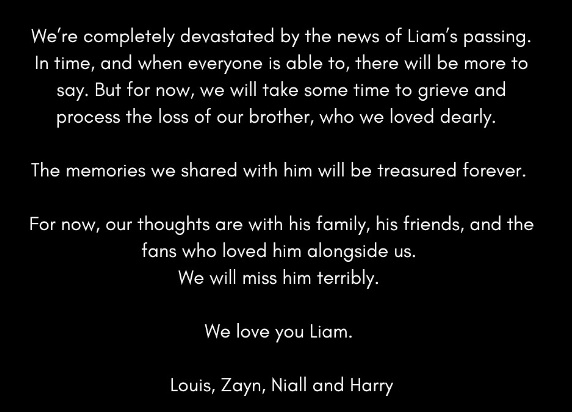 “Por ahora, nuestros pensamientos están con su familia, sus amigos y sus fans, que lo amaron junto a nosotros. Lo extrañaremos terriblemente. Te amamos, Liam”, cerraron.