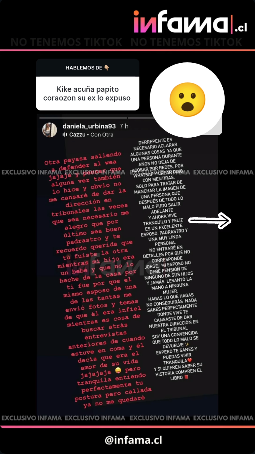 Sin embargo, los dichos encendieron la reacción de Daniela Urbina -expareja de Kike Acuña-, quien respondió sin filtros en la misma plataforma.