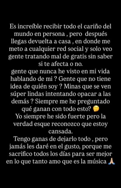 Finalmente, sostuvo que “tengo ganas de dejarlo todo, pero jamás les daré en el gusto, porque me sacrifico todos los días para ser mejor en lo que tanto amo, que es la música”.