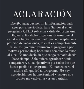 “El martes será el último día que iré al programa. Me voy agradecida por la oportunidad, y espero que pronto me vuelvan a ver en pantalla”, concluyó.