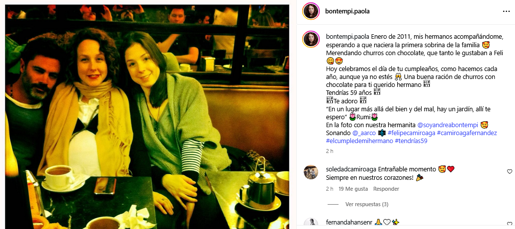“Enero de 2011, mis hermanos acompañándome, esperando a que naciera la primera sobrina de la familia. Merendando churros con chocolate, que tanto le gustaban a Feli”, escribió Bontempi.