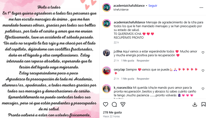 Finalmente, confirmó que está internada y con reposo absoluto, “esperando que la lesión del hígado vaya mejorando. Estoy recuperándome poco a poco. Agradezco la preocupación de toda mi academia… Pronto volveré a estar con ustedes físicamente, porque en pensamiento y corazón, ahí estoy”, cerró.
