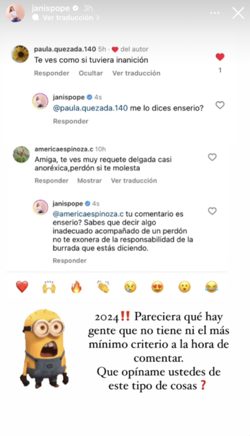 Janis no dudó en responderle, mostrándose sorprendida por el comentario. “Sabes qué, decir algo inadecuado, acompañado de un ‘perdón’, no te exonera de la responsabilidad de la burrada que estás diciendo”, precisó.
