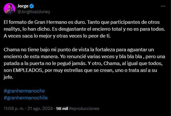 Mediante sus redes sociales, Jorge Aldoney no perdió la oportunidad de comentar la actitud de Chama, criticándola.