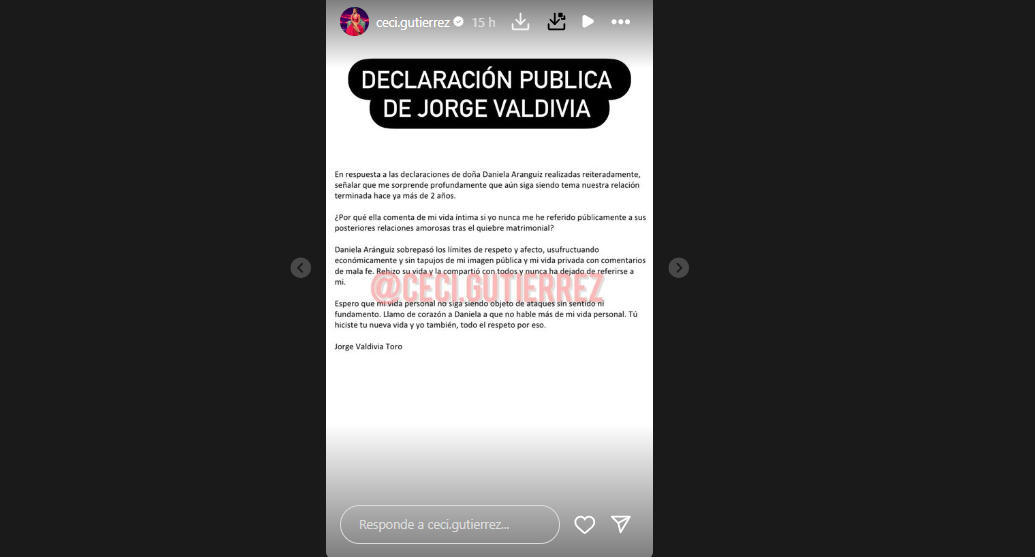 “Daniela Aránguiz sobrepasó los límites del respeto y el afecto, usufructuando económicamente y sin tapujos, de mi imagen pública y mi vida privada, con comentarios de mala fe”, señaló.