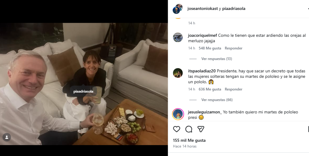 A través de Instagram, Kast publicó una fotografía junto a su esposa, María Pía Adriasola, con quien mantiene su tradicional “martes de pololeo”.