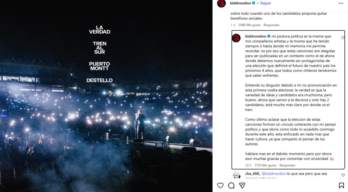 En plena recta final de la campaña presidencial, el cantante chileno Kidd Voodoo enfrentó un fuerte emplazamiento de parte de sus seguidores, quienes le exigieron pronunciarse políticamente antes de la segunda vuelta.