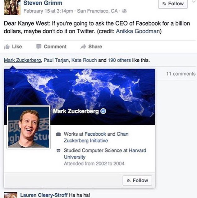 Según la información compartida por E!, fue a través de Facebook donde le llegó un revés al cantante. “Estimado Kanye West: Si le va a pedir al CEO de Facebook un billón de dólares, tal vez no lo deberías hacer por Twitter”, criticó el usuario Steven Grimm. Su publicación recibió el “like” del creador de la red social.