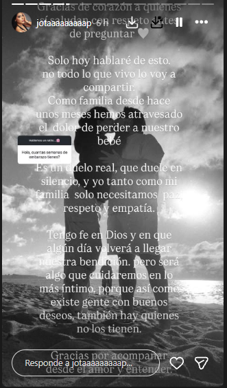 A renglón seguido, indicó que “como familia, desde hace unos meses hemos atravesado el dolor de perder a nuestro bebé. Es un duelo real, que duele en silencio. Y yo, tanto como mi familia, solo necesitamos paz, respeto y empatía”.