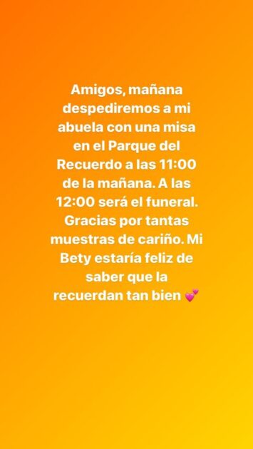 En otra publicación, la periodista reveló que los funerales de su abuela serán este lunes. “Gracias por tantas muestras de cariño. Mi Bety estaría feliz de saber que la recuerdan tan bien”, señaló.