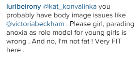 “Esta pobre niña está claramente enferma. Cómo una mujer madura, una madre que tiene una hija y una modelo a seguir para muchos, deberías dar un buen ejemplo al usar modelos que NO estén bajas de peso con peligrosos y bajos Índices de Masa Corporal. Una de cada 10 jóvenes sufre de desórdenes alimenticios antes de los 25 años”, le dijo otra seguidora.