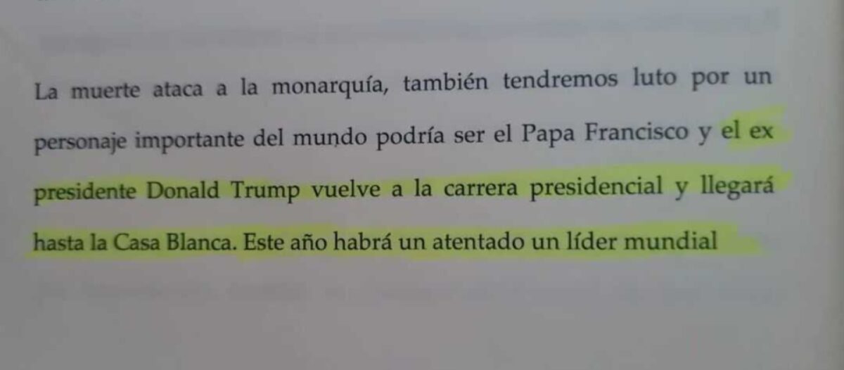 “El expresidente Donald Trump vuelve a la carrera presidencial y llegará hasta la Casa Blanca. Este año habrá un atentado a un líder mundial“, se lee en el texto.