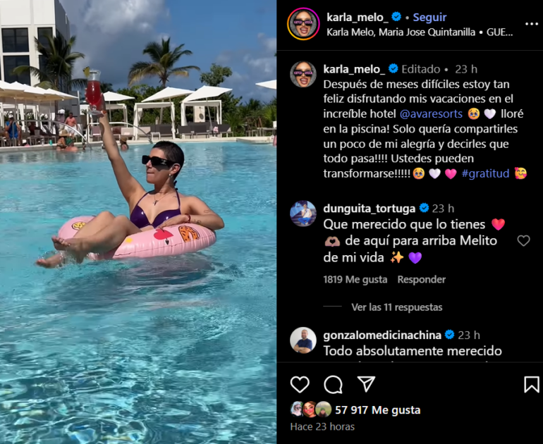 “Después de meses difíciles, estoy tan feliz disfrutando mis vacaciones en un increíble hotel. ¡Lloré en la piscina!”, reconoció Karla Melo junto al clip que suma cerca de 60 mil “me gusta”.