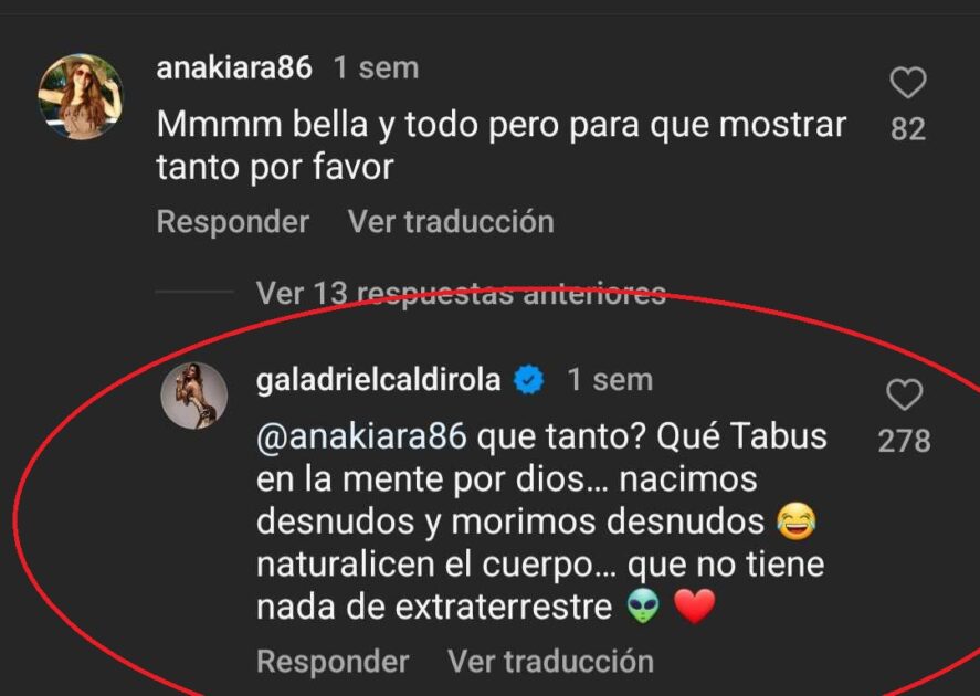 “¿Qué tanto? Qué tabúes en la mente, por Dios. Nacimos desnudos y morimos desnudos. Naturalicemos el cuerpo, que no tiene nada de extrarrestre“, respondió.