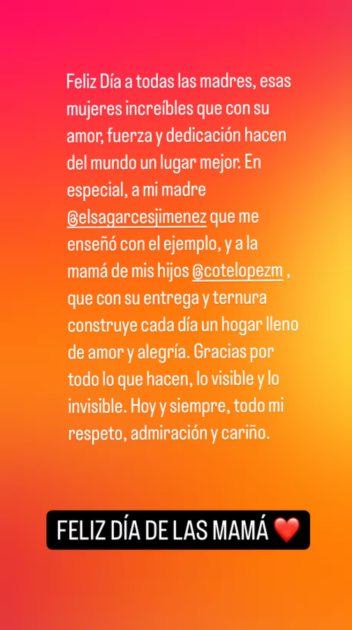 “Y a la mamá de mis hijos, Coté López, que con su entrega y ternura construye cada día un hogar lleno de amor y alegría. Gracias a todo lo que hacen, lo visible y lo invisible. Hoy y siempre, todo mi respeto, admiración y cariño”, cerró.