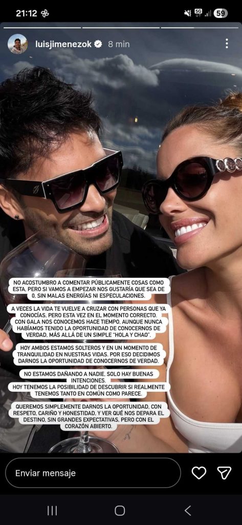 “Queremos, simplemente, darnos la oportunidad con respeto, cariño y honestidad y ver qué nos depara el destino, sin grandes expectativas, pero con el corazón abierto”, cerró Mago Jiménez en la publicación junto a Gala Caldirola.