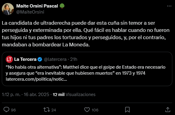 Maite Orsini se sumó a la ola de críticas que recibió Evelyn Matthei luego de justificar la dictadura de Augusto Pinochet y tildar como “inevitables” los crímenes de lesa humanidad cometidos en ese periodo.