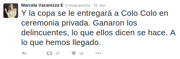 “Y la copa se entregará a Colo Colo en ceremonia privada. Ganaron los delincuentes, lo que ellos dicen se hace. A lo que hemos llegado”, tuiteó la esposa del conductor del Festival de Vina del Mar.