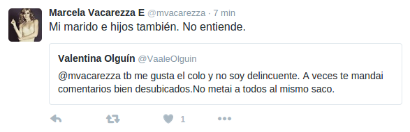Esta publicación hizo que muchos colocolinos interpretaran que la blonda los estaba tratando de delincuentes sólo por seguir a un equipo determinado. De hecho Vacarezza respondió uno de los tuit para aclarar el asunto.