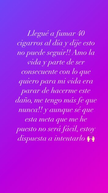 “Llegué a fumar 40 cigarros al día y dije ‘esto no puede seguir’. Amo la vida y parte de ser consecuente con lo que quiero era parar de hacerme este daño, me tengo más fe que nunca”, recalcó.