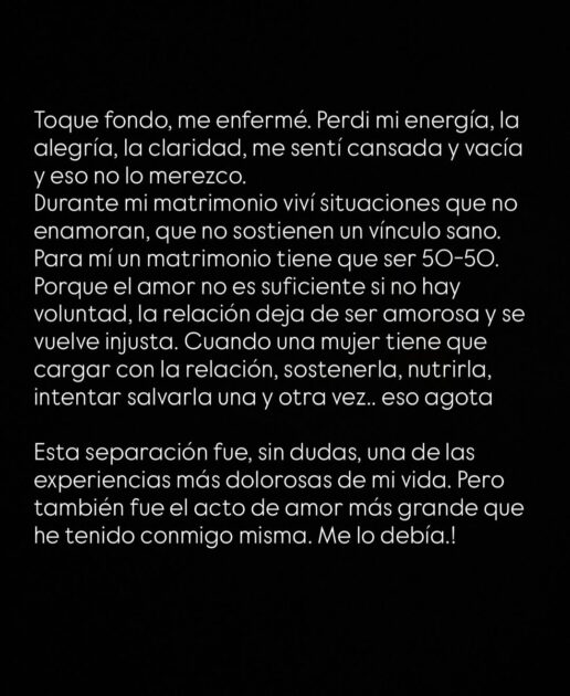 “Esta separación fue, sin dudas, una de las experiencias más dolorosas de mi vida. Pero también fue el acto de amor más grande que he tenido conmigo misma. Me lo debía”, dijo.