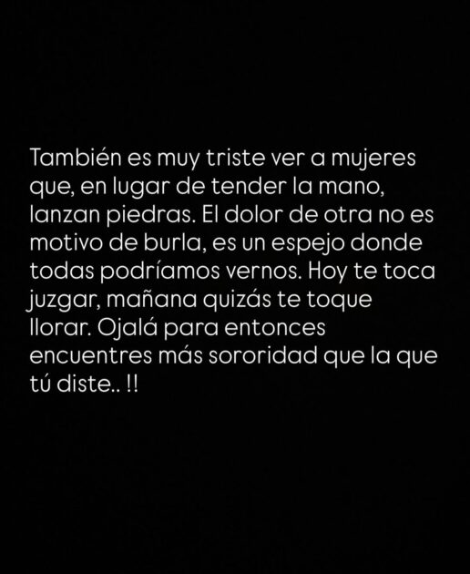 “También es muy triste ver a mujeres que, en lugar de tender la mano, lanzan piedras. El dolor de otra no es motivo de burlas, es un espejo donde todas podríamos vernos”, indicó.