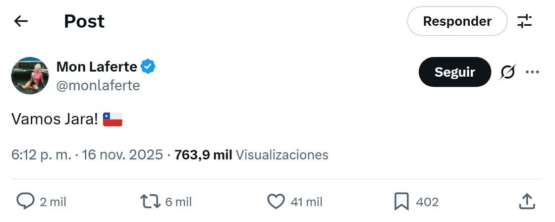 La cantante utilizó su cuenta en X para manifestar abiertamente su respaldo a la abanderada del progresismo, Jeannette Jara, un gesto que sorprendió a sus seguidores durante la tarde de este domingo.