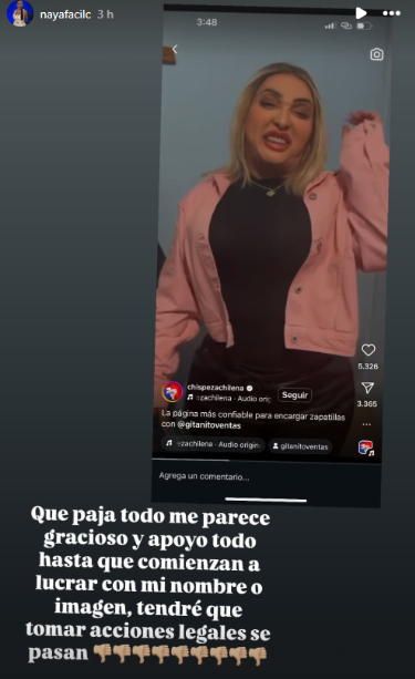 “Me parece gracioso y apoyo todo, hasta que comienzan a lucrar con mi nombre o imagen. Tendré que tomar acciones legales, se pasan“, sostuvo Naya Fácil.