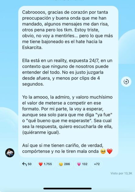 “Cabros, gracias de corazón por tanta preocupación y buena onda que me han mandado. Algunos mensajes me dan risa, otros pena, pero los ‘tkm’. Estoy triste, obvio, no voy a mentirles… pero lo que más me tiene bajoneado es el hate hacia la Eskarcita”, comenzó el texto.