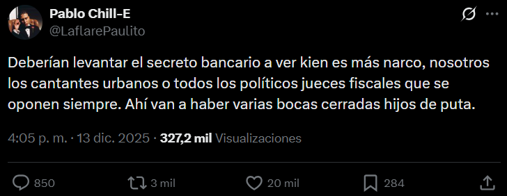 Tras esto, Pablo Chill-E también se refirió al debate sobre el levantamiento del secreto bancario, planteando que esta medida permitiría esclarecer eventuales vínculos con actividades ilícitas.