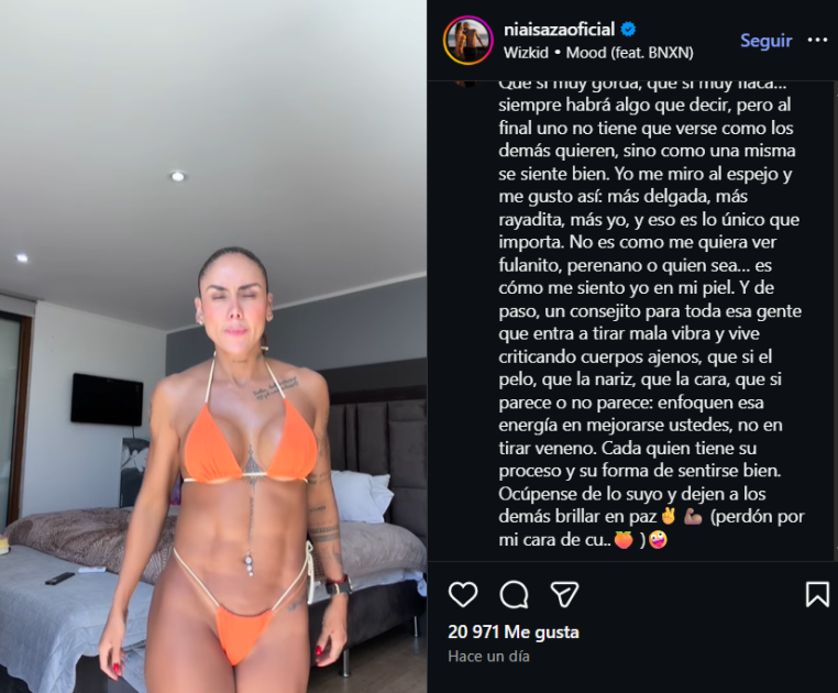 Isaza profundizó en que lo único que realmente considera relevante es su satisfacción personal: “Yo me miro al espejo y me gusto así: más delgada, más rayadita, más yo, y eso es lo único que importa. No es como me quiera ver fulanito o quien sea… es cómo me siento yo en mi piel”.
