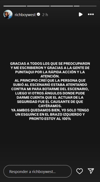 “Al principio, creí que la persona que subió al escenario estaba atentando contra mí para botarme del escenario”, admitió en el comunicado compartido en Instagram.