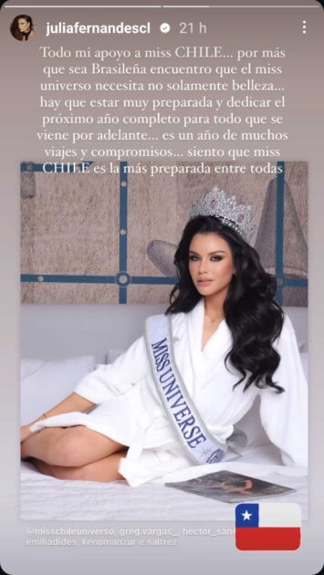 “Todo mi apoyo a Miss Chile… por más que sea brasileña”, comenzó el mensaje viralizado en sus historias de Instagram.