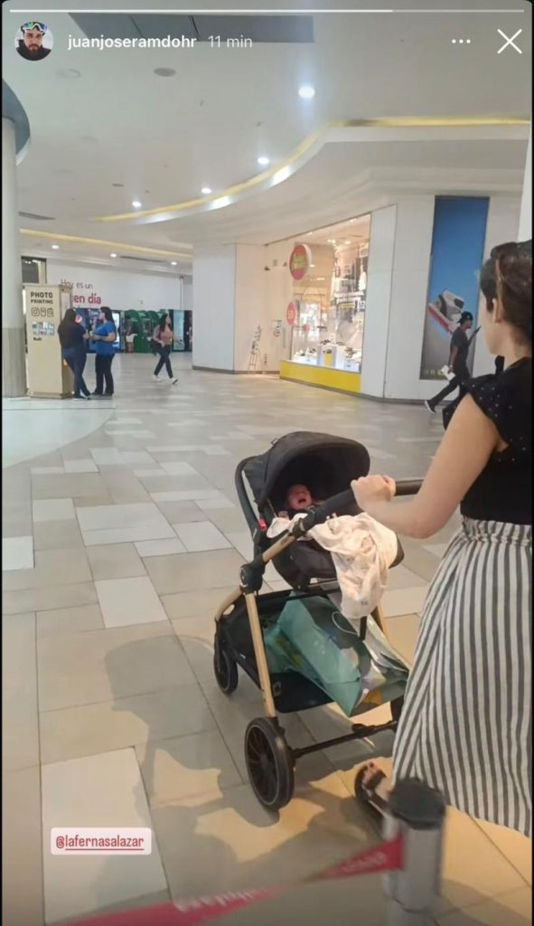 La escena publicada por Ramdohr los mostró disfrutando de un paseo con el bebé, en un coche dentro de un centro comercial, donde con humor señaló: “su primer vehículo, qué emoción”.