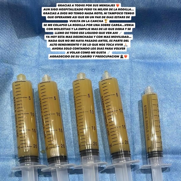 “Gracias a Dios no tengo nada roto, ni tampoco tengo que operarme. Se me colapsó la rodilla por una sobrecarga. Venía con molestias y la empujé más de lo que debía y se llenó de todo ese líquido que ven ahí”, partió contando el bailarín en una historia.