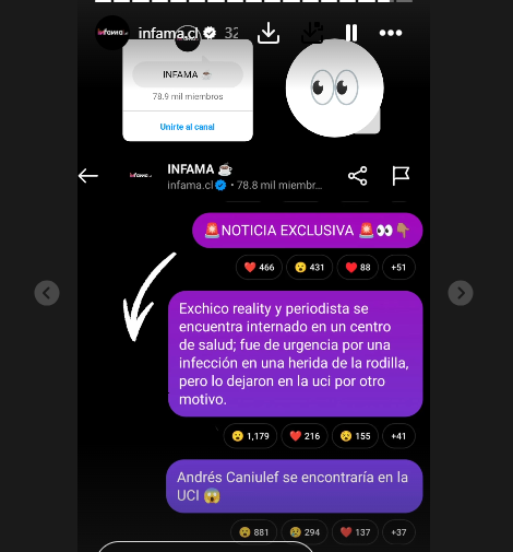 “Exchico reality y periodista se encuentra internado en un centro de salud. Fue de urgencia por una infección en una herida de la rodilla, pero lo dejaron en la UCI por otro motivo. Andrés Caniulef se encontraría en la UCI”, señalaron.
