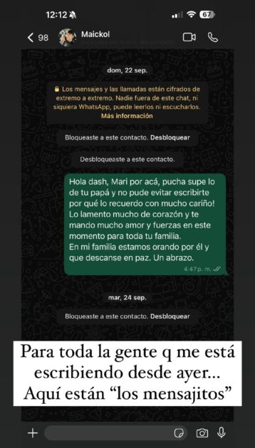 “Hola, Dash. Mari por acá. Pucha, supe lo de tu papá y no pude evitar escribirte porque lo recuerdo con mucho cariño”, decía el único mensaje que mandó Blue Mary a Dash por WhatsApp.